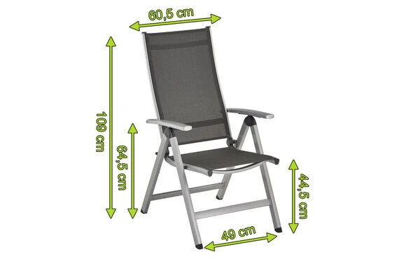 Mittels Rasterschiene lässt sich der Sessel leicht in 4 verschiedene Positionen bringen – so wird der Komfort eines Liegestuhls direkt integriert. Sowohl das solide und formschöne Gestell als auch die Armlehnen bestehen aus edlem, silberfarbenem Aluminium. Die anthrazitfarbene Sitzfläche wurde mit einem grauen Faden verstärkt. Sie ist aus wasserdurchlässigem, hochwertigem Outdoorgewebe gefertigt. Das luftige Gewebe nimmt kein Wasser auf und trocknet schnell, so können Sie auch nach einem kleinen Regenschauer rasch wieder Platz nehmen. Es ist formstabil aber trotzdem sehr bequem und zusätzlich UV- und sonnenölbeständig – insgesamt also der perfekte Begleiter in Ihrem Garten. Dank der leichten Materialien und des Klappmechanismus ist der Stuhl leicht zu handhaben – wenn er nicht benötigt wird, können Sie ihn platzsparend verstauen.