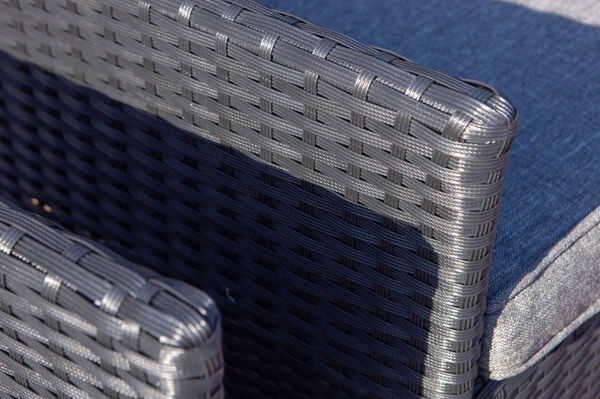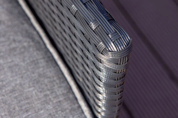 Das Untergestell des Möbelstücks besteht aus Aluminium, dies macht es nicht nur stabil, sondern sorgt auch dafür, dass es sich aufgrund des relativ geringen Gewichts ganz leicht hin und her stellen lässt. Dazu sorgt die Pulverbeschichtung auf dem Aluminium für eine verbesserte Korrosionsbeständigkeit. Das Aluminiumgestell wird mit Polyrattangeflecht bespannt. Aufgrund der enormen Wetterbeständigkeit von Polyrattan können Sie diese Diningsessel ohne Bedenken nach Abnahme der Polster das ganze Jahr über im Freien stehen lassen. Das flache Geflecht ist in der Farbe schwarz (Faser w1) gehalten und bietet so ein optisches Highlight in allen Terrasseneinrichtungen! Gemütliche Sitz- und Rückenpolster (100 % Olefin (200 g/m³)) mit einer Stärke von ca. 5 cm sorgen für höchsten Sitzkomfort. Farblich sind die grau melierten Polster perfekt auf das Geflecht abgestimmt. Die synthetische Faser Olefin wird für ihre Hitzebeständigkeit und optimalen Trage- und Pflegeeigenschaften geschätzt. Sollten Sie einmal Falten in Ihren Polstern haben, werden diese bei Wärme von alleine verschwinden, sodass die Bezüge komplett bügelfrei sind. Textilien aus Olefin sind bequem, hautkühlend, waschbar und bügelfrei. Sie eignen sich perfekt für den Einsatz im Freien, was nicht zuletzt an ihrer wasserabweisenden und atmungsaktiven Materialzusammensetzung liegt.