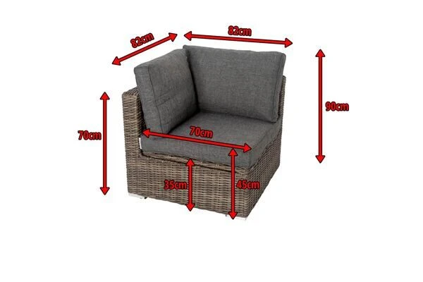 Das Polyrattan Eckelement hat ein Stellmaß von ca. 82 x 82 x 70 cm. Mit seinem geringen Gewicht lässt sich das Modul leicht verstellen und verrücken, so dass Sie Ihre neue Wohlfühloase jederzeit neu anordnen können. Das Eckelement ist jeweils mit bis zu ca. 150 kg belastbar.
