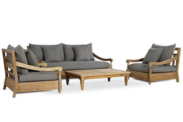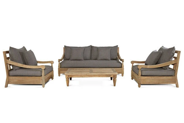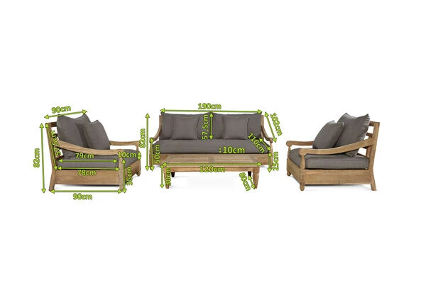 Urlaub direkt Zuhause: Mit Maßen von ca. 190 x 102 x 82 cm bietet das 2-Sitzer Sofa eine Sitzbreite von ca. 178 cm und bequeme Armlehnen. Mit einer Sitztiefe von ca. 101 cm und einer Sitzhöhe von ca. 25 cm lässt es sich gemütlich entspannen. Die passenden Sessel haben die Maße von von ca. 90 x 90 x 82 cm und bieten Ihnen mit einer Sitztiefe von ca. 79 cm und einer Sitzhöhe von ca. 25 cm ein komfortables Sitzgefühl. Die passenden ca. 10 cm dicken Polster mit einem Bezug aus hochwertigem Sunproof® Olefin in der Trendfarbe grau sorgen für noch mehr Wohlbefinden und wird Sie begeistern. Mit Maßen von ca. 120 x 80 x 31 cm ist der Tisch optimal für Kaffekränzchen, Spielerunden oder einfach gemütliches Beisammensein geeignet. Ein herrlicher Rückzugsort, um den Alltag hinter sich zu lassen. Das wiederverwertete Teakholz verleiht der Loungegruppe ein ganz besonderes Flair, jedes Möbelstück ist so einzigartig wie die Geschichte des verwendeten Holzes. Auch die Maserung ist individuell, so dass jedes Sofa ein wahres Einzelstück ist. Die rustikal gebürstete Oberfläche sorgt dafür, dass die natürliche Struktur des Holzes erhalten bleibt und die Maserung besonders gut zur Geltung kommt. Im Zusammenspiel mit dem natürlich gestalteten Gestell verleiht sie dem Sofa somit sein außergewöhnliches Aussehen, das zum Highlight in jedem Garten wird.