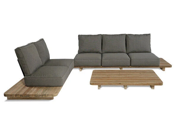 OUTFLEXX® massive Ecklounge aus recyceltem FSC®-Teakholz inkl. Loungetisch sowie Polster in grau, für 5 Personen