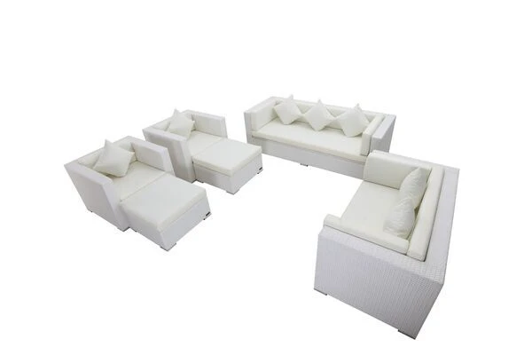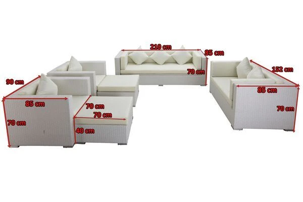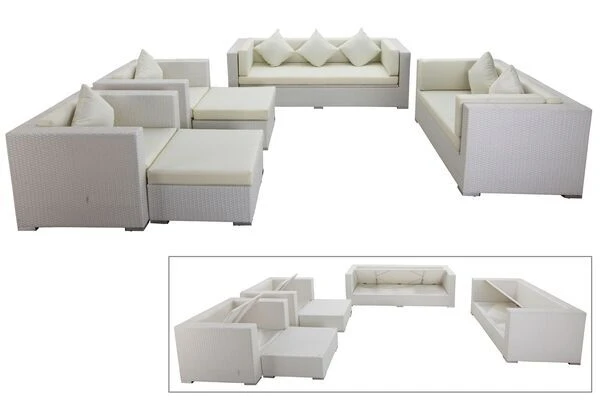 Das Lounge-Set in weiß besteht aus zwei mit Polstern ausgestatteten Polyrattan Sesseln, einem 3-Sitzer Sofa, einem 2-Sitzer Sofa sowie zwei Hockern, die Sie aufgrund der mitgelieferten Sicherheitsglasplatten ganz einfach und schnell in Tische umfunktionieren können. Dieses Set bietet Ihnen also alles, was Sie für einen schönen Sommer im Garten benötigen und wird garantiert der neue Blickfang in Ihrem Garten oder auf der Terrasse.