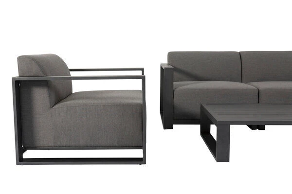 Jede Sitzfläche der modernen Loungegruppe ist mit ca. 64 cm Tiefe und ca. 83 cm Breite großzügig proportioniert und kombiniert mit den luxuriösen Polstern erhalten Sie höchsten Sitzgenuss. Auf der geräumigen Sitzfläche der Ecklounge lässt es sich auch herrlich bei einem Mittagsschläfchen entschleunigen. Und der Hocker bietet nicht nur eine tolle Sitzgelegenheit, er ist auch perfekt zum Hochlegen Ihrer Füße oder zum Vergrößern der Liegefläche. Bei den Sitzmöbeln unterstreicht das Zusammenspiel aus robusten pulverbeschichteten Aluminium-Gestellen mit Polstern aus Sunbrella-Schaumstoff in „flanelle“ den hochwertigen Charakter der Polstermöbel. Die einzigartige Materialkombination wertet jeden Loungebereich auf und wird Sie und Ihre Gäste begeistern. Der elegante, rechteckige Kaffeetisch in dark-grey hat eine Größe von ca. 100 x 80 cm und eine Gesamthöhe von ca. 30 cm. Das Tischgestell und die ca. 3 cm starke Tischplatte bestehen ebenfalls aus pulverbeschichtetem Aluminium, was ihm seine edle Optik und einen natürlichen Look verleiht. Die Platte ist robust, pflegeleicht und dazu noch wetterfest – hier kommt man gerne zusammen. Dank des geringen Gewichts lassen sich die Möbel auch leicht an Ihren Lieblingsplätzen im Garten, auf der Terrasse oder dem Balkon platzieren. Hier sitzen Sie nicht nur bequem, sondern mit Stil. Genießen Sie die Erholung in Ihrem Garten mit einen Hauch Beach Club-Feeling.