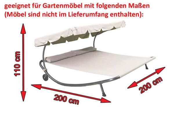 Bitte beachten Sie: Diese Abdeckhaube passt perfekt zu Doppelliegen (z.B. von Leco oder OUTFLEXX®) mit Maßen von ca. 200 x 200 x 110 cm (z.B. LECO Liege, Artikelnr. 7927).