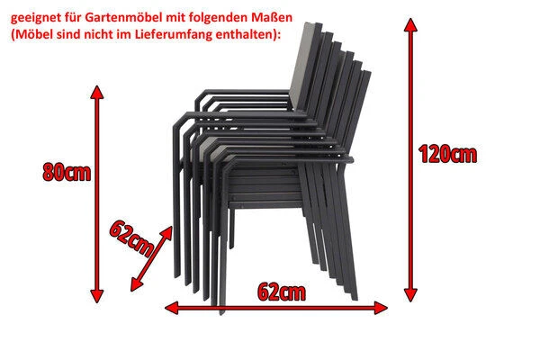 Bitte beachten Sie: Diese Abdeckhaube passt perfekt zu Stapelstühlen mit Maßen von ca. 62 x 62 x 80/120 cm (gestapelt).