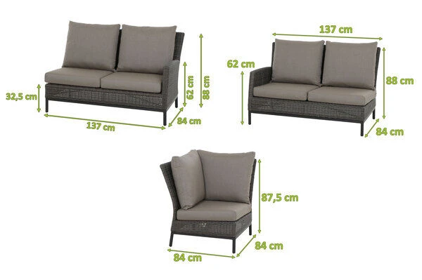 Einfach zurücklehnen und entspannen. Egal ob Sie die Beine hochlegen und ein gutes Buch in der Sonne lesen, gemütlich zusammen mit Freunden ein Kaffeekränzchen halten oder in gepflegter Atmosphäre den Alltag gemächlich an sich vorbeiziehen lassen möchten. Dieses bequeme Loungeset, bestehend aus zwei Zweisitzern und einem Eckmodul, ist der ideale Begleiter und lädt Sie jederzeit zum Verweilen ein. Die breite Sitzfläche bietet genügend Platz für 5 Personen. Bei einer Sitzhöhe von ca. 33 cm ohne Kissen lässt es sich herrlich entspannen. Passende, extra starke Kissen verleihen den Sitzmöbeln ein unvergleichliches Sitzerlebnis.