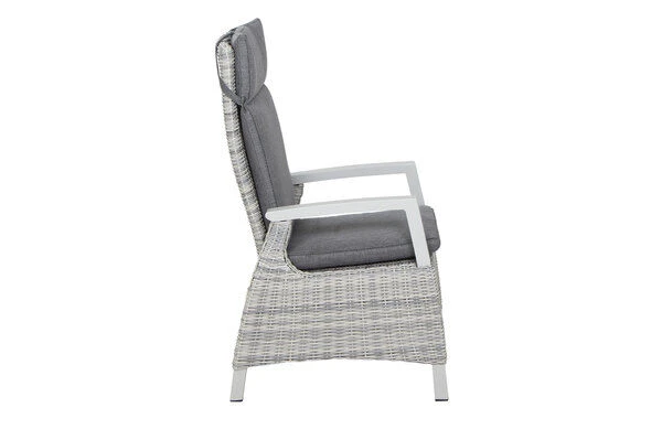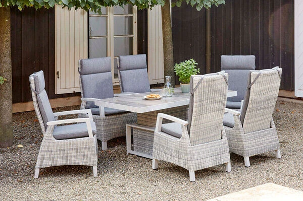 Holen Sie sich eine Extraportion Komfort in Ihren Garten und verbringen Sie in gepflegter Atmosphäre den Tag auf Ihrer Terrasse: bei einem leckeren Frühstück, bei einem genüsslichen Brunch oder lassen Sie bei einem Abendessen den Tag in geselliger Runde ausklingen. Dieser bequeme Dining Sessel lädt Sie und Ihre Gäste jederzeit zum Zurücklehnen und Verweilen ein. Stellen Sie die Rückenlehne des Anpassungskünstlers ganz einfach über einen Knopf in der Armlehne stufenlos ein. Die verbesserte Movetechnik sorgt für eine sanft laufende Rückenlehne, die müheloses Entspannen ermöglicht. Der Sessel hat ein Gesamtmaß von ca. 76 x 62 x 109 cm. Die ca. 50 cm breite Sitzfläche bietet genügend Platz. Mit einer großzügigen Sitztiefe von ca. 48 cm und bei einer Sitzhöhe von ca. 44 cm lässt es sich hier auch herrlich bei einem Nickerchen entschleunigen. Die praktischen Armlehnen aus Aluminium in einer Höhe von ca. 64 cm bieten zusätzlichen Komfort und sind echte Hingucker. Passende Sitzpolster in der Trendfarbe stone grey verleihen dem Sitzmöbel ein unvergleichliches Sitzerlebnis.