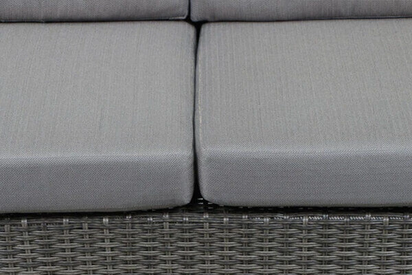 Das Untergestell des Möbelstücks besteht aus pulverbeschichtetem Aluminium, dies macht es nicht nur stabil, sondern sorgt auch dafür, dass es sich aufgrund des relativ geringen Gewichts ganz leicht hin und her stellen lässt. Das Aluminiumgestell wird mit doppelhalbrundem GARDINO®-Geflecht bespannt. Die Basis dieses Geflechts bildet der Kunststoff Polyethylen. Durch die geringe Feuchtigkeitsaufnahme dieser Faser trocknet sie besonders schnell und ist dadurch schmutzunempfindlich. Zudem zeichnet sie sich durch eine natürliche Optik aus und erzeugt eine edle und moderne Ausstrahlung. Der moderne Grauton der Faser passt perfekt zu den meisten Einrichtungsstilen und Gartengestaltungen. Gemütliche Sitz- und Rückenpolster sowie gestreifte Dekokissen (100 % Polypropylen (280 g/m²)) sorgen für höchsten Sitzkomfort. Farblich sind die grauen Polster perfekt auf das Geflecht abgestimmt.