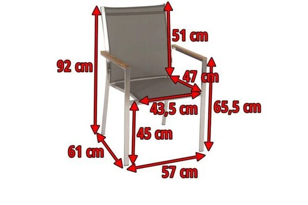 Der Cardiff überzeugt nicht nur mit seinem zeitlosen Design und den hochwertigen Materialien, sondern vor allem auch durch seinen Komfort und seine Funktionalität. Schlicht, unauffällig und dennoch ein Hingucker. So lässt sich der Cardiff wohl am besten beschreiben. Holen Sie sich mit diesem Stapelsessel Eleganz vereint mit perfektem Sitzkomfort nach Hause und genießen Sie entspannte Stunden z.B. nach Ihrem Feierabend. Die hochwertigen Materialien und die sorgfältige Verarbeitung sorgen nicht nur für die besondere Optik dieses Stuhls, sondern machen ihn mit einer Belastbarkeit von ca. 120 kg zusdem sehr stabil. Der Cardiff wird Ihnen durch seine hohe Widerstandsfähigkeit gegen Wind und Wetter viele Jahre Freude bereiten. Das verwendete Edelstahl der Güteklasse 304 ist rostfrei und ebenso wie das Textilgewebe der Sitzfläche und Rückenlehne besonders pflegeleicht. Leichte Verschmutzungen lassen sich ganz einfach mit ein wenig Wasser wieder entfernen. Das für die Armlehnen verwendete Teakholz ist FSC-zertifiziert und stammt damit aus verantwortungsvollen Quellen. So können Sie sich guten Gewissens zurücklehnen und sich so richtig entspannen. Durch seine Stapelfunktion und den Maßen von ca. 61 x 57 x 92 cm lässt sich der Stuhl aber dennoch platzsparend verstauen, wenn Sie doch einmal etwas mehr Platz auf Ihrer Terasse oder im Garten benötigen sollten.